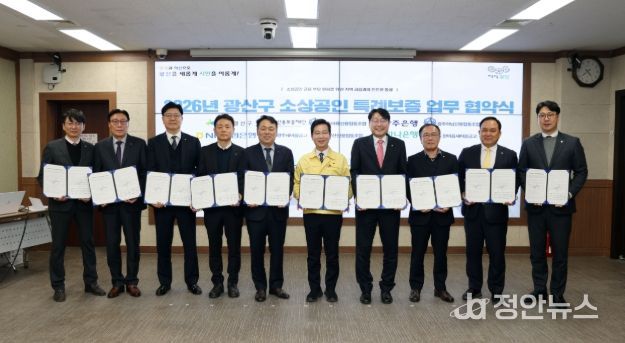 정안뉴스 안정주 기자 | 광주 광산구가 6일 구청 2층 회의실에서 광주신용보증재단(이사장 염규송), 지역 금융기관 8개소(△광주어룡신협·광주하남신협·우산신협 △광주은행 △하나은행 △농협△서광주새마을금고·한마음새마을금고)와 함께 ‘2026년 광산구 소상공인 특례보증 업무협약’을 체결했다.