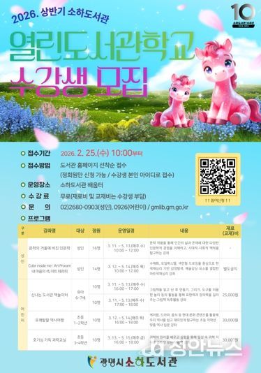 정안뉴스 안정주 기자 | 광명시 소하도서관이 ‘2026년 상반기 열린도서관학교’ 수강생을 모집한다.