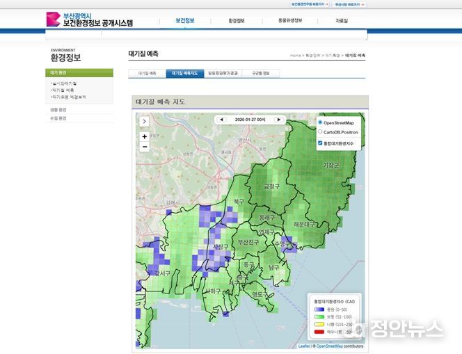 정안뉴스 황정혜 기자 | 부산시 보건환경연구원은 시민 생활권의 대기질 상태를 쉽고 직관적으로 이해할 수 있도록 '지역별 상세 대기질 예측지도 서비스'를 운영한다고 밝혔다.