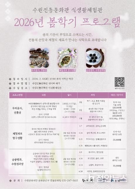 정안뉴스 안정주 기자 | 수원문화재단은 오는 10일부터 수원전통문화관 식생활체험관 2026년 봄학기 프로그램 참여자를 모집한다. 이번 봄학기 프로그램은 계절의 변화에 맞춘 전통 식문화와 다양한 음식을 시민들이 쉽고 재미있게 경험할 수 있도록 기획했다. 전통장 담그기부터 제철 식재료 요리, 궁중병과 체험까지 다양한 내용으로 운영한다.