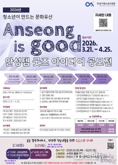정안뉴스 안정주 기자 | 안성시청소년수련관은 청소년이 지역 문화유산을 창의적인 굿즈로 재해석하는 '2026 청소년이 만드는 문화유산 ‘안성템 굿즈 아이디어 공모전’'을 개최하고, 오는 3월부터 참가 청소년을 모집한다고 밝혔다.