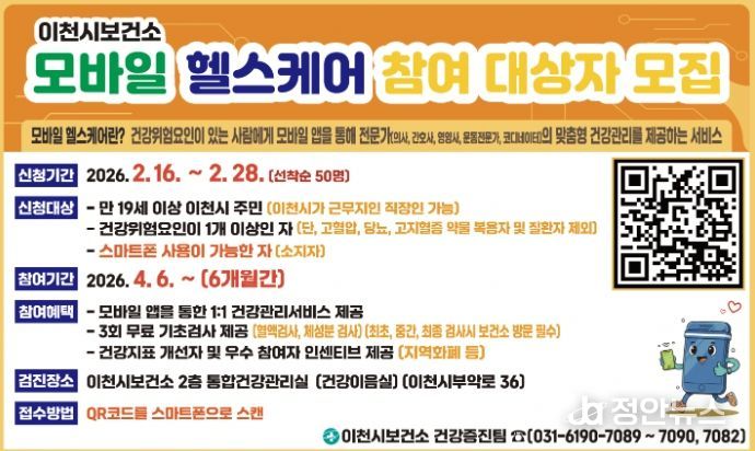 정안뉴스 안정주 기자 | 이천시는 스마트폰을 활용한 맞춤형 건강관리 서비스를 제공하는 모바일 헬스케어 사업 대상자를 2월 16일부터 2월 28일까지 선착순으로 모집한다.