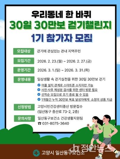정안뉴스 안정주 기자 | 고양특례시 일산동구보건소는 지역 주민의 기초 체력 증진과 신체활동 활성화를 위해 기획한‘우리동네 한 바퀴 30일 30만보 걷기 챌린지’1기 참가자를 오는 23일부터 모집한다.
