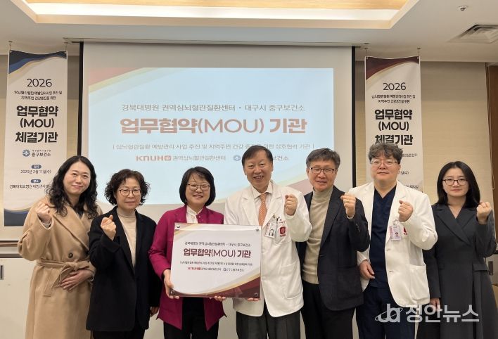 정안뉴스 안정주 기자 | 대구 중구보건소(소장 황석선)는 지난 11일 경북대학교병원 권역심뇌혈관질환센터와 심뇌혈관질환 예방관리사업의 체계적 추진을 위한 업무협약(MOU)을 체결했다.