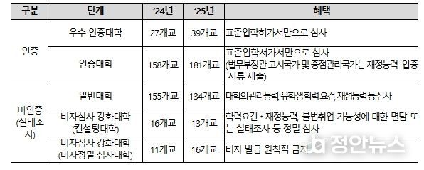 한편, 인증대학 외에 외국인 유학생이 1명 이상 재적 중인 대학에 대해서는 ‘유학생 유치‧관리 실태조사’를 실시하고, 일정 기준을 충족하지 못할 시 비자심사 강화대학(컨설팅대학, 비자정밀 심사대학)으로 지정했다. 이를 통해 대학이 외국인 유학생의 유치 단계에서 어학 능력과 재정 능력 등을 엄격히 심사하도록 하고, 유학생 관리 전반에 대한 대학의 책임을 강화할 예정이다.