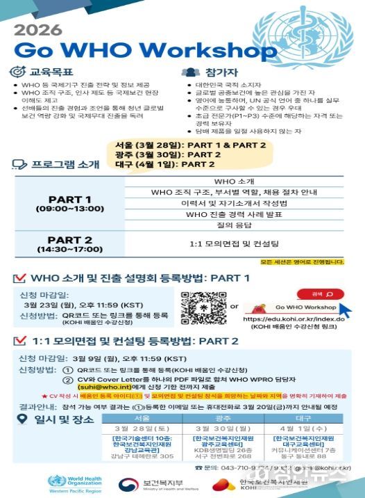 워크숍은 WHO(세계보건기구) 진출에 관심이 있는 대한민국 국민이라면 누구나 지원할 수 있다. 참가 신청은 2026년 3월 23일까지 포스터에 게재된 방법을 통해 온라인으로 신청할 수 있다.