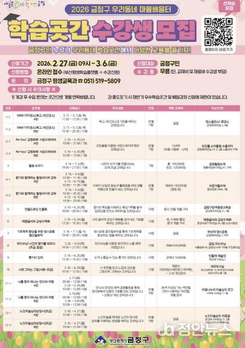 정안뉴스 황정혜 기자 | 부산 금정구는 우리 동네 마을배움터인 ‘학습곳간’30개소를 지정하고 2월 27일부터 수강생을 모집한다.