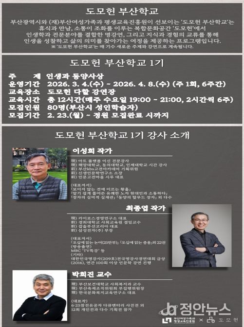 정안뉴스 황정혜 기자 | 부산시는 과거 시장 관사에서 시민을 위한 복합문화공간으로 재탄생한 '도모헌'에서 시민들의 삶에 깊이를 더하고 인생 2막의 이정표를 제시하는 '2026년 도모헌 부산학교 프로그램'을 본격 운영한다고 밝혔다.