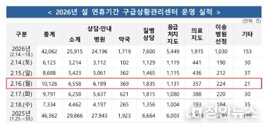 정안뉴스 안정주 기자 | 소방청은 2026년 설 연휴 기간(2.14.~2.18., 5일간)전국 총 45,082건의 구급 출동으로 24,166명을 이송하였으며, 구급상황관리센터에서 총 42,062건의 상담을 실시했다고 밝혔다.