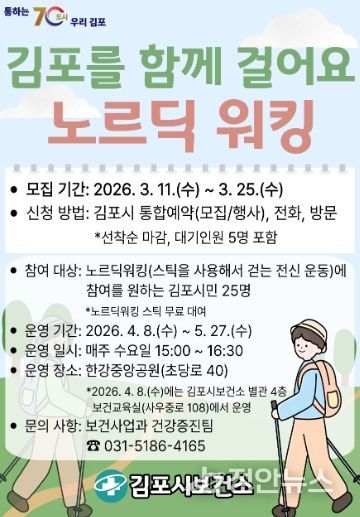 모집 대상은 올바른 보행과 북유럽식 걷기(노르딕 워킹)에 관심 있는 20세 이상 김포시민 25명으로, 참여를 원하는 시민은 신분증을 지참해 보건소를 방문하거나 전화 또는 김포시 통합예약시스템(모집·행사)을 통해 신청하면 된다.