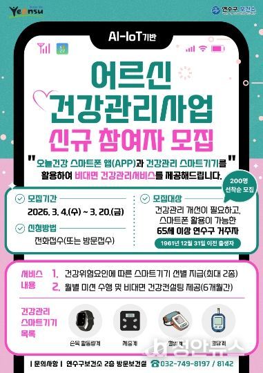 정안뉴스 안정주 기자 | 연수구가 65세 이상 어르신을 대상으로 인공지능 사물인터넷을 활용한 건강관리사업 신규 참여자를 4일부터 선착순 모집한다.