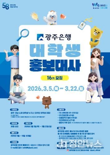 정안뉴스 안정주 기자 | 광주은행은 오는 5일부터 광주·전남 지역 소재 대학생을 대상으로 ‘제16기 대학생 홍보대사’를 모집한다고 밝혔다.