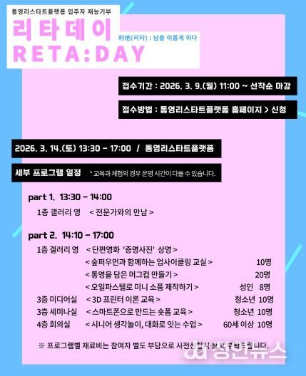 정안뉴스 김재홍 기자 | 통영시는 오는 14일진행되는 통영리스타트플랫폼 입주자 재능기부 프로그램 ‘리타(利他)데이’ 참여자를 모집한다고 전했다.