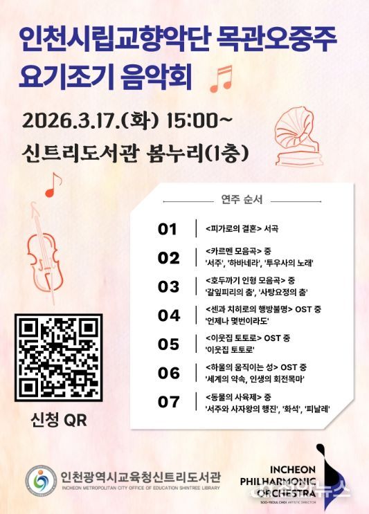 정안뉴스 안정주 기자 | 인천광역시교육청신트리도서관은 오는 17일 도서관 내 봄누리홀에서 지역 주민을 대상으로 ‘인천시립교향악단과 함께하는 해설이 있는 음악회’를 개최한다.