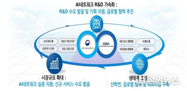 AINA는 6G 표준 완성(’28년), 6G 상용화(’30년~) 등 네트워크 세대 진화에 발맞춰 AI-RAN을 비롯한 ‘차세대 이동통신 시장 점유율 20%(現 5%)’를 목표로 한다. 이를 위해 ▲산업계 수요 기반 기술개발 로드맵 제시, ▲전후방(AI) 생태계와 긴밀히 연계한 AI네트워크 수요 창출, ▲해외시장 진출을 위한 글로벌 주요 기업·단체와의 협력을 주도한다.