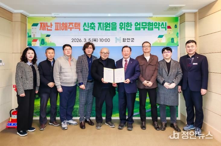정안뉴스 김재홍 기자 | 함안군은 지난 5일 군청 2층 군수실에서 재난으로 주택 피해를 입은 군민의 신속한 주거 안정과 일상 회복을 지원하기 위해 함안지역건축사회와 ‘재난 피해 주택 신축 지원을 위한 업무협약’을 체결했다고 밝혔다.