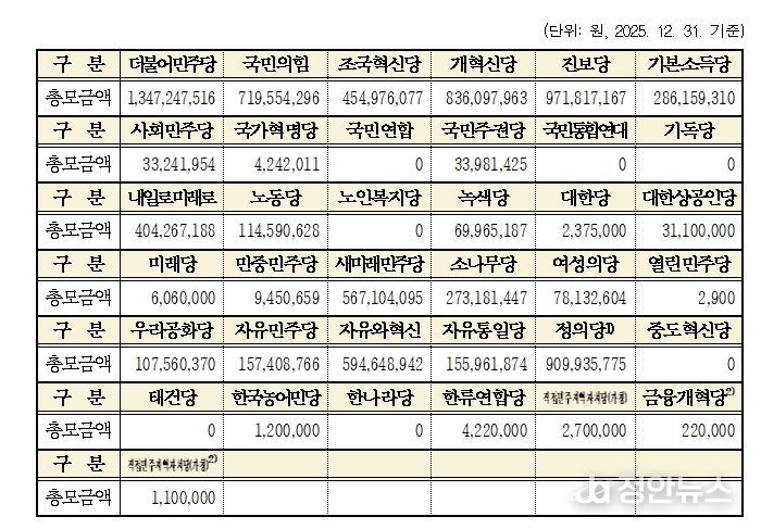 정안뉴스 안정주 기자 | 중앙선거관리위원회는 2025년도 중앙당후원회와 국회의원후원회의 후원금 모금내역을 집계한 결과, 37개의 중앙당(중앙당창당준비위원회 포함)후원회가 총 81억 7천8백여만 원을, 303개의 국회의원후원회가 총 608억 3천2백여만 원을 모금했다고 밝혔다.