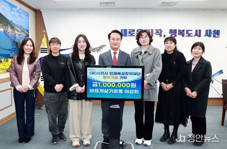정안뉴스 김재홍 기자 | 바르게살기운동 사천시협의회 여성회(회장 이옥진)는 10일 사천시청 시장실을 방문하여 지역 사회의 미래를 이끌어갈 인재 양성을 위해 사용해 달라며 사천시 인재육성장학재단(이사장 박동식)에 장학금 100만 원을 기탁했다.