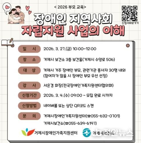 교육 신청은 3월 4일부터 30명 선착순 모집이며, 이미지의 QR코드를 스캔하여 신청하거나 거제시장애인가족지원센터 또는 건강증진과로 문의하면 된다.