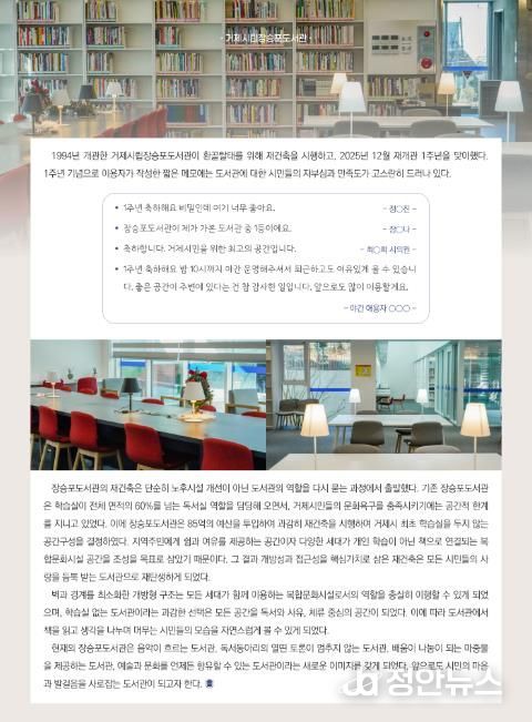 평생교육과 강세영 과장은 ‘전국 도서관을 대표하는 잡지 표지에 장승포도서관이 소개되어 매우 뜻깊게 생각한다’며 앞으로도 시민들이 일상 속에서 편안하게 머물며 책과 문화를 즐길 수 있는 열린 도서관이 되도록 노력하겠다고 밝혔다.