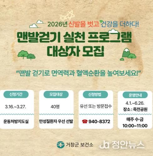 이정헌 보건소장은 “맨발걷기는 발바닥 자극을 통해 혈액순환 개선과 스트레스 완화 등 건강 증진에 도움을 줄 수 있는 생활 속 신체활동”이라며 “주민들이 자연 속에서 맨발로 걷는 즐거움을 느끼는 기회가 되길 바란다”고 말했다.