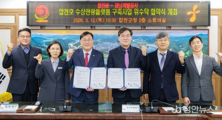 정안뉴스 김재홍 기자 | 합천군은 12일 군청에서 합천호 수상관광플랫폼 구축사업의 원활한 추진을 위해 경남개발공사와 위·수탁 협약을 체결했다.