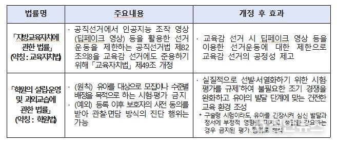 교육부는 이번 법률 개정을 통해, 공직선거에서 인공지능 조작 영상(딥페이크 영상) 등을 활용한 선거운동을 제한하는 '공직선거법' 제82조의8을 교육감 선거에도 준용하여 교육감 선거의 공정성을 높이고자 했다.