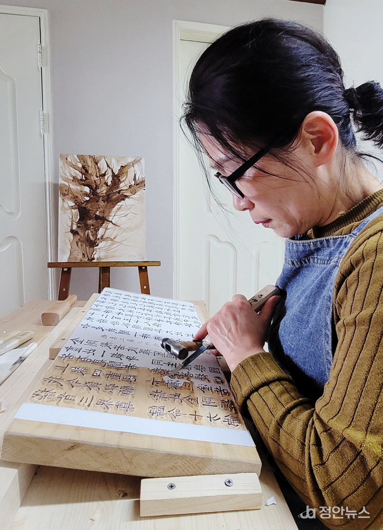 진용숙 회원은 판각 작업의 의미를 자신의 전공 분야와 비교하며 설명했다. “서각이 작가의 개성과 감정이 드러나는 개인 예술이라면, 판각은 목판 인쇄를 위해 한 자 한 자 정성을 들여 글자를 새겨 완성하는 공동 작업이라고 생각합니다.” 처음 잡아보는 칼과 망치는 낯설었지만 글자를 새기는 과정에서 마음이 자연스럽게 차분해졌다고 한다. “글자를 새기다 보면 저절로 참회하는 마음이 올라옵니다. 어느 순간 눈물이 날 것 같아 꾹 참고 작업했던 기억도 있습니다.”