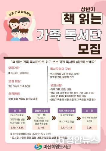 정안뉴스 김재홍 기자 | 창원시 마산회원도서관은 가족 독서문화 확산을 위해 ‘책 읽는 가족 독서단’을 운영하고 3월 10일 부터 3월 31일까지 상반기 참여 가족을 모집한다.