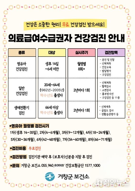 정안뉴스 김재홍 기자 | 거창군은 의료급여수급권자의 건강증진과 질병 예방을 위해 2026년도 건강검진 비용을 연중 지원한다.