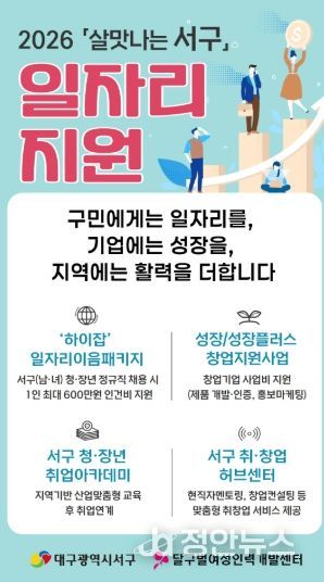 정안뉴스 안정주 기자 | 대구 서구는 지역 청·장년에게 안정적인 일자리를 제공하고 기업 성장을 지원하기 위해 ‘2026년 살맛나는 서구 일자리 지원사업’을 본격 추진한다고 밝혔다.