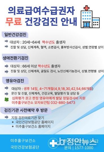 정안뉴스 안정주 기자 | 인천 미추홀구가 의료 취약계층의 질환을 조기에 발견하고 건강 증진을 도모하기 위해 ‘의료급여 수급권자 일반·영유아 건강검진 수검’을 적극 독려하고 있다.