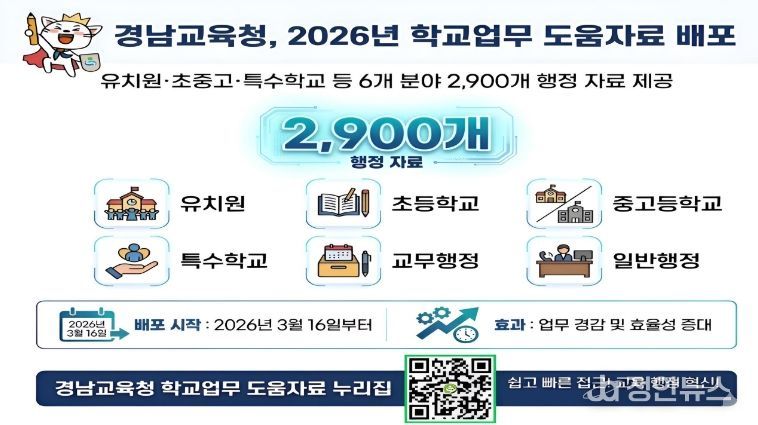 정안뉴스 김재홍 기자 | 경상남도교육청은 학교 현장의 행정 부담을 줄이고 교직원의 업무 편의성을 높이기 위해 오는 16일 이후 ‘2026년 학교업무 도움자료’를 보급한다.