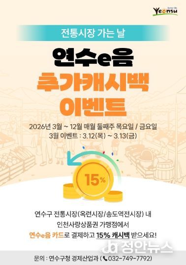 정안뉴스 안정주 기자 | 연수구는 이달부터 12월까지 매월 둘째 주 목요일과 금요일에 ‘전통시장 가는 날 연수e음 추가 캐시백 이벤트’를 운영한다.