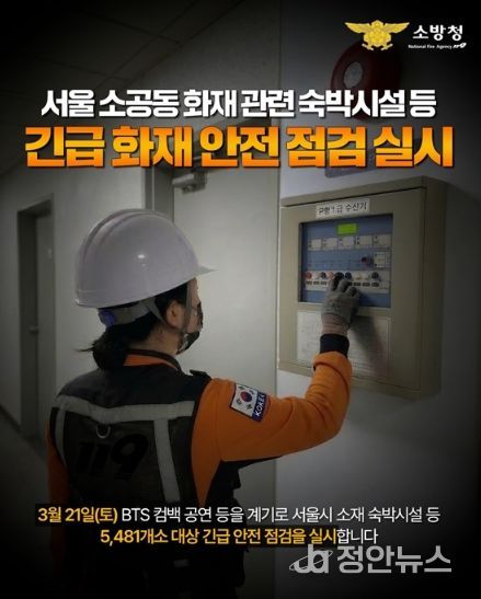 정안뉴스 안정주 기자 | 서울 소공동 화재 관련 숙박시설 등 긴급 화재 안전점검 실시