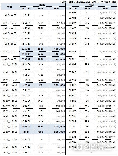 또한 2026시즌부터 시행되는 아시아쿼터 선수들의 연봉도 집계됐다. LG 웰스, SSG 타케다, 두산 타무라가 각각 20만 달러씩 받으며 아시아쿼터 선수 연봉(계약금 포함) 공동 1위에 올랐다.