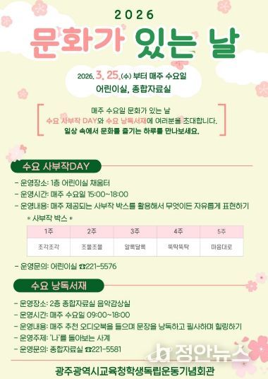 학생독립운동기념회관 김용일 관장은 “시민과 어린이들이 일상을 작은 축제처럼 즐길 수 있는 열린 도서관을 만들겠다”며 “매주 수요일마다 열리는 ‘문화가 있는 날’ 프로그램에 많은 시민과 어린이들이 참여하길 바란다”고 말했다.