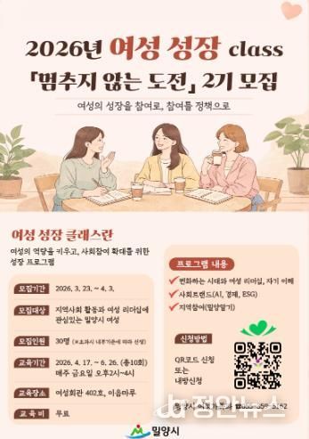 정안뉴스 김재홍 기자 | 경남 밀양시는 여성친화도시 조성의 일환으로, 여성의 사회참여 확대와 리더십 역량 강화를 위한 2026년 여성 성장 class ‘멈추지 않는 도전’ 제2기 수강생을 모집한다.