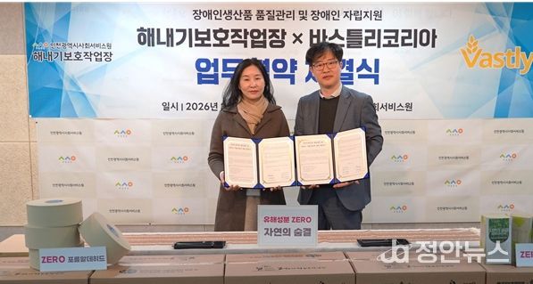 정안뉴스 안정주 기자 | 인천시사회서비스원 소속 해내기보호작업장은 천연유래 대체원료 화장지 전문기업 바스틀리코리아와 손잡고 장애인 자립지원과 탄소중립 실천에 나선다고 19일 밝혔다.