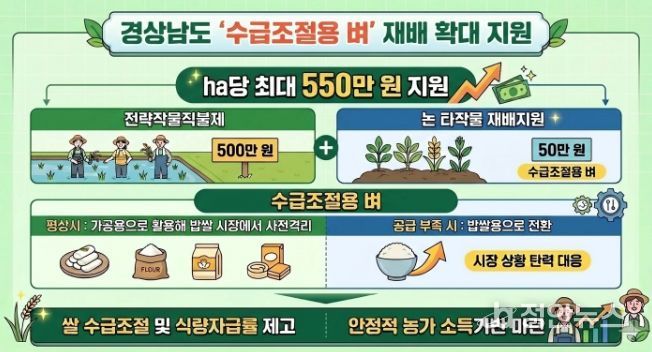 정안뉴스 김재홍 기자 | 경남도는 쌀 수급 안정과 농가 소득 보전을 위해 올해부터 ‘논 타작물 재배지원 사업’에 ‘수급조절용 벼’를 신규 품목으로 추가하고, 전략작물직불제와 연계해 헥타르(ha)당 최대 550만 원을 지원한다고 밝혔다.