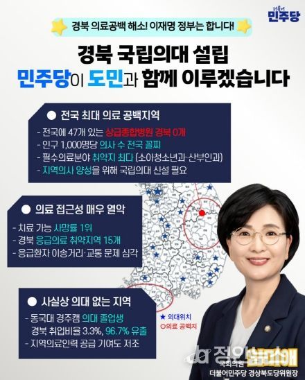 정안뉴스 안정주 기자 | 더불어민주당 경상북도당 위원장인 임미애 국회의원이 경북 지역의 숙원 사업인 ‘국립의과대학 설립’을 위해 대통령과 주무 부처 장관을 잇달아 만나는 광폭 행보를 펼치는 한편 도민과 함께하는 본격적인 홍보 캠페인에 돌입했다.
