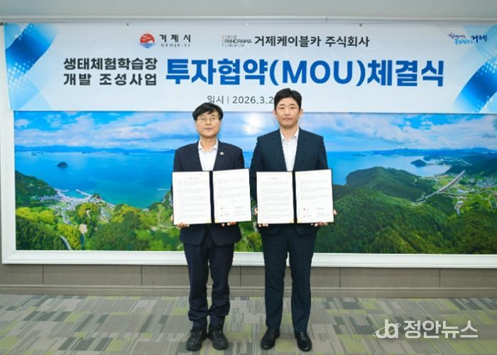 정안뉴스 김재홍 기자 | 거제시는 23일, 거제케이블카 주식회사와 지역 관광 활성화 및 생태교육 인프라 확충을 위한‘생태체험학습장 개발 조성사업’투자협약(MOU)를 체결했다.