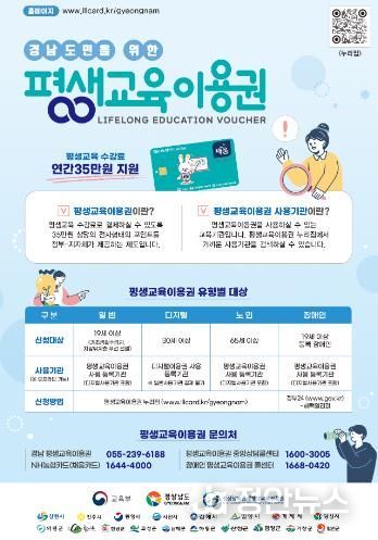 경상남도 평생교육이용권 사업은 경제적·사회적 여건으로 인해 학습기회가 적은 군민에게 교육 비용을 지원해 학습 기회 제공 및 교육격차 완화를 목적으로 하고 있다.