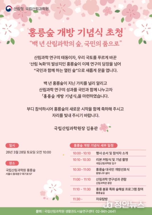 정안뉴스 안정주 기자 | 산림청 국립산림과학원은 28일 오전 10시 서울특별시 동대문구 홍릉숲에서 ‘홍릉숲 개방 기념식’을 개최한다고 밝혔다.
