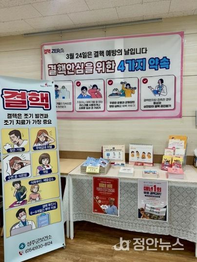 정안뉴스 안정주 기자 | 성주군은 ‘제16회 결핵 예방의 날(매년 3월 24일)’을 맞아 결핵에 대한 올바른 정보를 알리고 조기 검진 참여를 독려하기 위해 '결핵 예방 주간'을 운영한다고 밝혔다.