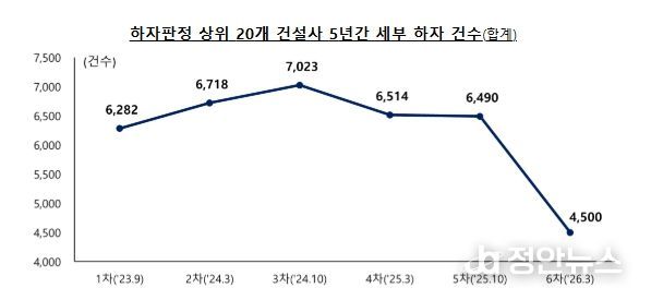 최근 5년(’21.3~’26.2) 누계 기준으로는, (주)순영종합건설(383건, 세부 하자수 기준), (주)대명종합건설(318건), 에스엠상선(주)(311건), 제일건설(주)(299건), (주)대우건설(293건) 순으로, 대형 건설사의 세부 하자 수 감소에 따라 그간 1차 발표(’23.9)부터 유사했던 상위 건설사 순위가 금번 발표 시 크게 변동된 것으로 나타났다.