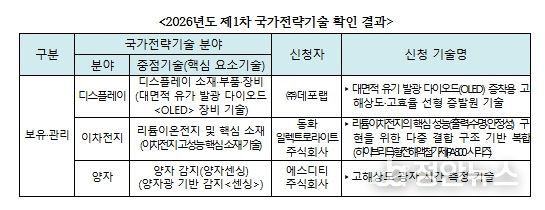 정안뉴스 안정주 기자 | 과학기술정보통신부와 한국과학기술기획평가원(원장 직무대행 황지호,)은 ‘2026년도 제1차 국가전략기술 확인 신청’에 대해 총 3건의 기술(디스플레이, 이차전지, 양자 분야)이 국가전략기술에 해당하는 것으로 확인했다.