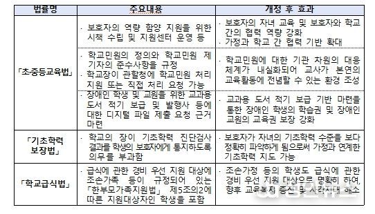 교육부는 이번 법률 개정을 통해 국가와 지방자치단체가 보호자의 역량 함양과 교육 정책에 대한 이해 및 소통을 지원하기 위한 시책을 수립하도록 했다. 또한 학부모 정책 추진을 위한 실태조사와 함께 보호자 교육에 행정·재정적 지원을 할 수 있는 근거를 마련했다. 아울러 보호자 교육과 보호자의 학교 참여 등에 대한 정보를 제공하는 전국‧지역 학부모지원센터의 설치·운영 근거도 신설했다.