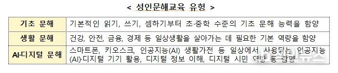 성인 문해교육 지원사업은 배움의 기회를 놓친 어르신 등에게 읽기·쓰기·셈하기 등 기초 문해 역량부터 건강, 안전, 금융 등 일상생활에 필요한 역량, 나아가 인공지능(AI)·디지털 활용 역량까지 함양할 수 있도록 지원하는 사업이다.