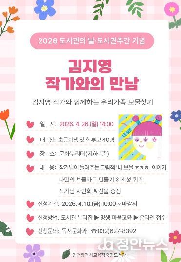정안뉴스 안정주 기자 | 인천광역시교육청중앙도서관은 오는 26일, 초등학교 저학년 어린이와 가족을 대상으로 김지영 그림책 작가와의 만남을 운영한다.